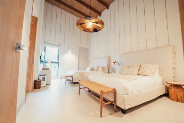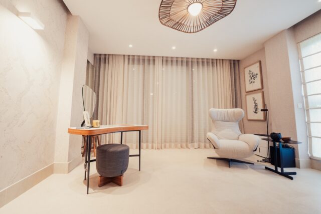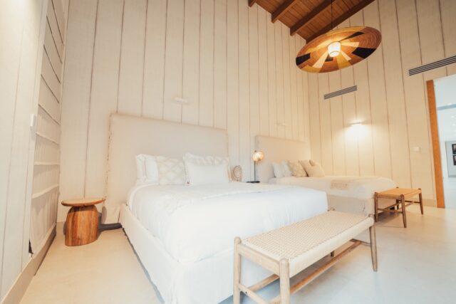 The villa also includes a private study, perfect for quiet moments or catching up on work. One of the bathrooms features a soaking tub, inviting you to unwind and relax.