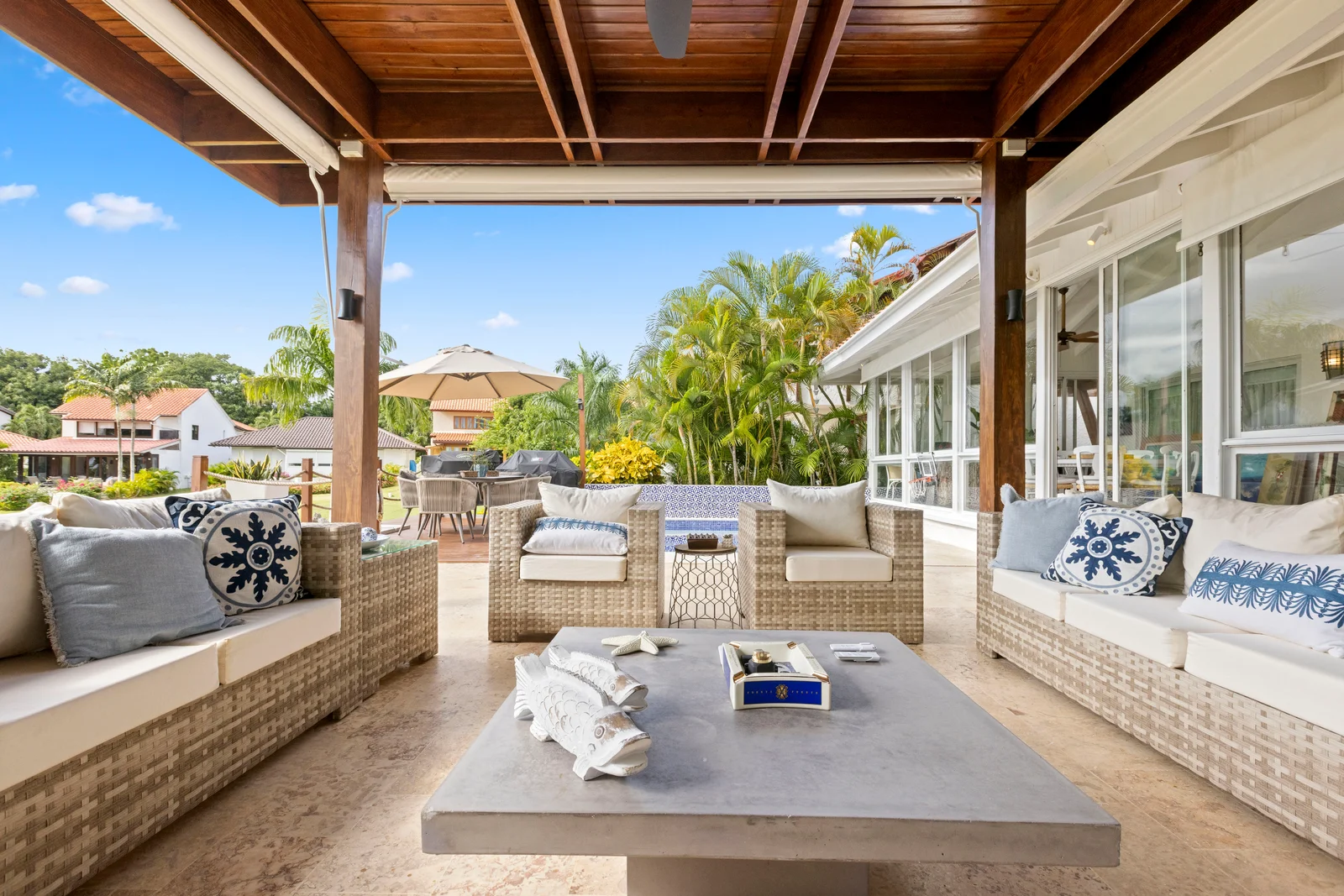 The home includes daily services from a full-time housekeeper/cook and a maintenance man, both working from 9 a.m. to 4 p.m. They can also stay to prepare and serve dinner with advance notice for a small taxi fee. Housekeeping is included, and the villa can be stocked with groceries before your arrival upon request (we do our best to meet dietary needs). The housekeeper can prepare meals throughout your stay, including breakfast, lunch, and dinner—local menu options are available. The back porch is complete with two BBQs, pool (heat/jacuzzi option), a dining table for six, and additional seating.